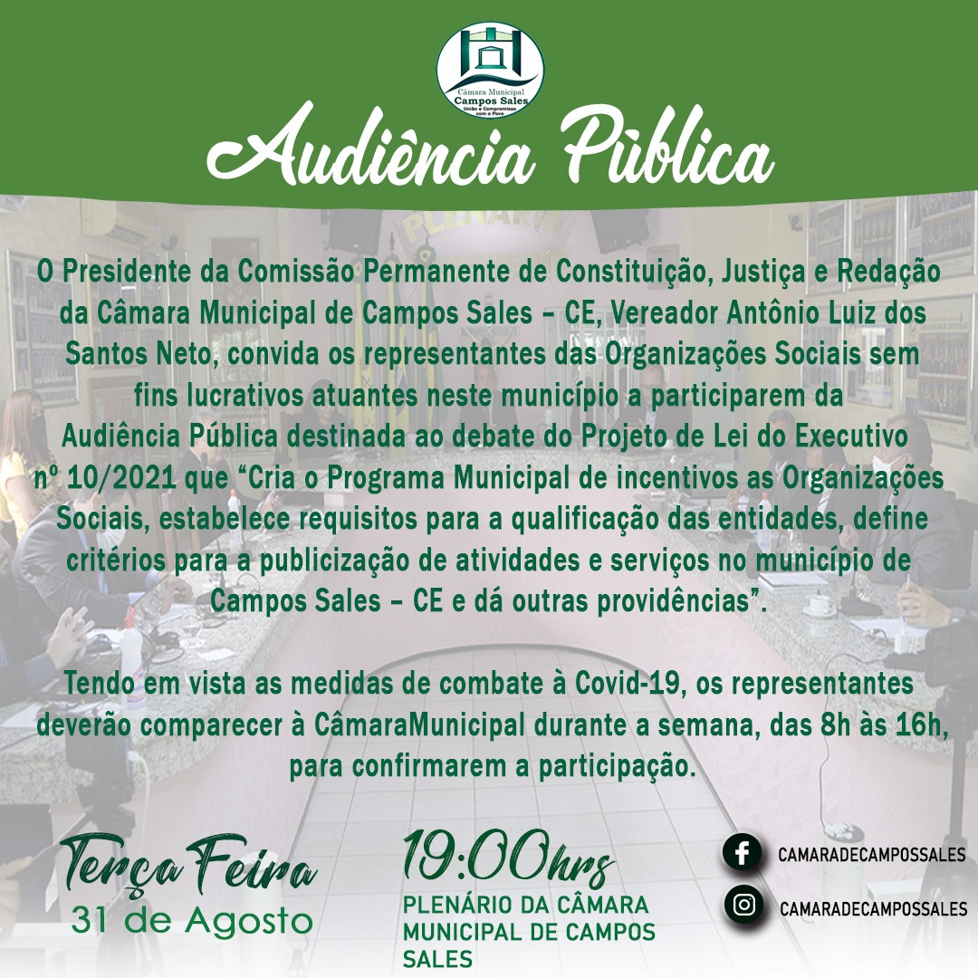 A Comissão Permanente de Constituição, Justiça e Redação da Câmara Municipal de Campos Sales realizará Audiência Pública para debater o Projeto de Lei do Executivo n° 10/2021 que cria o Programa Municipal de Incentivos as Organizações Sociais, estabelece requisitos para a qualificação das entidades, define critérios para a publicização de atividades e serviços no município”.